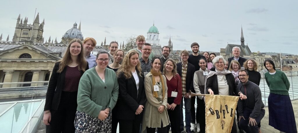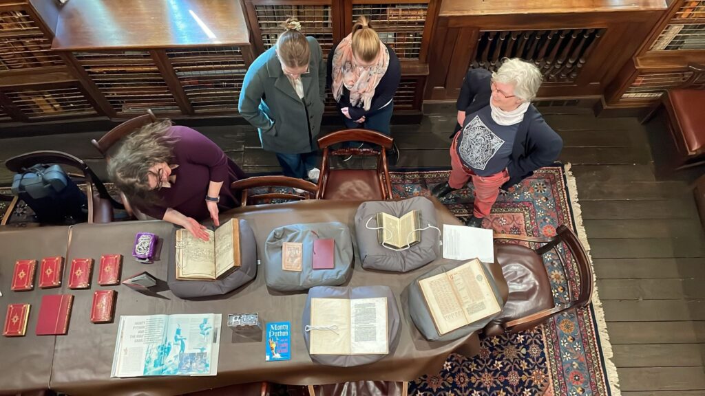 The GBOFFL participants — from universities whose cities make up the abbreviated title, i.e. Geneva, Bern, Oxford, Freiburg (im Breisgau), Freiburg (im Üechtland), and Lausanne — kicked off the conference with a gathering in the cosy, climate-controlled Old Library of Teddy Hall, where they noshed anise cake and perused materials from the Hall’s collection, including a pamphlet on St Edmund and a Monty Python-themed cardboard catapult.