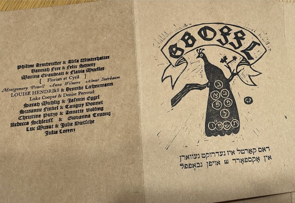The card lists the names of workshop participants and bears a description in Yiddish: “דאָס קאַרטל איז געדרוקט געװאָרן אין אָקספֿאָרד אויפֿן גבאָפֿפֿל” — “This card was printed in Oxford at the GBOFFL.”