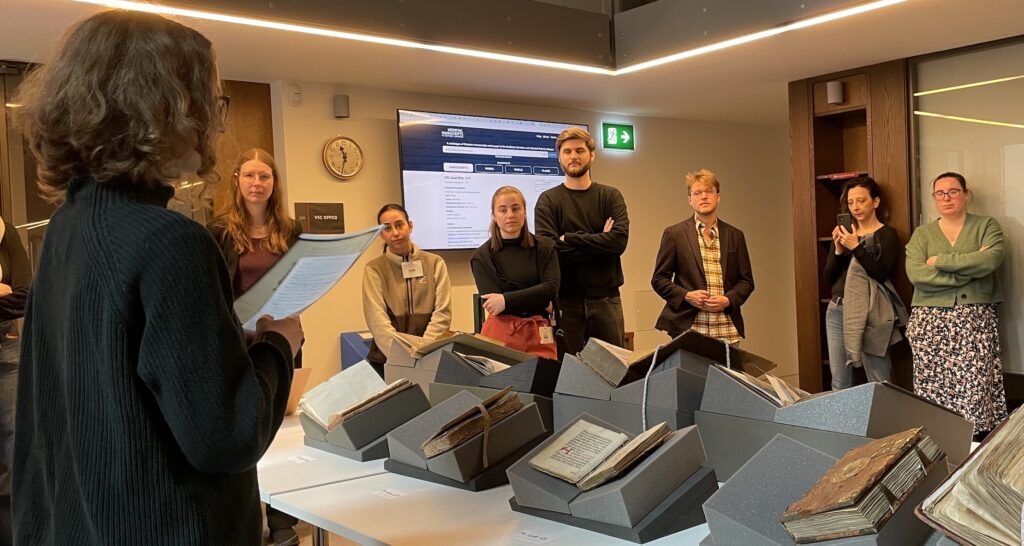 The GBOFFLers returned the next day to Teddy’s Doctorow Hall for an enlivening of the senses — an early lecture by Susanne Finkel on visual poetics in Partonopier and Meliur works. The schedule called for a trip to the Weston Library for the weekly Coffee Morning, this week led by Philine Armbruster, Lucian Shepherd, and Henrike Lähnemann on the topic of manuscript fragments (and, as usual, including a few minutes for gazing at the dreaming spires from the roof terrace).