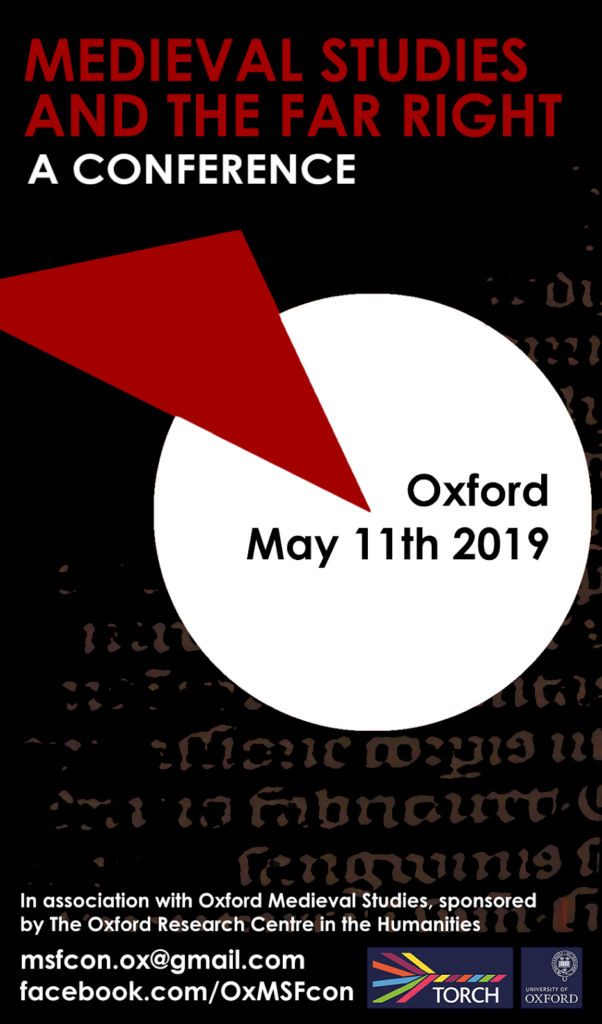We had speakers from every academic stage from recent graduate to professor, and for some early career researchers, it was an excellent opportunity to present in an explicitly contemporary-focused and intellectually open space. It was important to us that the conference should be free to attend, and not limited to established academic researchers, as the casual delineation of academic from non-academic spaces is part of the issue at hand. It is important that this conference be a starting point for further discussion both inside and outside academic medieval studies, and we will be hosting recordings of the papers on the open-access oxtalks website to help facilitate this. We hope to organise more events in the future and develop models for truly open-access discussion that resists the cordoning-off of academic interests, and we hope to see our fellow medievalists resisting the far right in the pages of journals, in the press, and on the streets.
