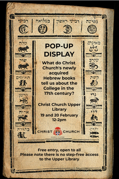 You are warmly invited to attend our third pop-up display of the term: “What do Christ Church’s newly acquired Hebrew books tell us about the College in the 17th century?”