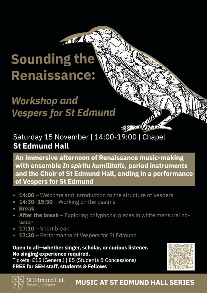 The historical wind and vocal ensemble In Spiritu Humilitatis joins the Choir of St Edmund Hall for an immersive exploration of Renaissance Vespers. Reading directly from original choirbooks in white mensural notation, and guided by the sound of cornetts, sackbuts, and voices, participants will rediscover the expressive freedom of improvised polyphony and the luminous sonorities of early sacred music.